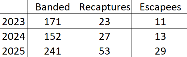 You’re a clever cookie! Because we know, scientifically, there is a greater likelihood of having even more birds in the park and because we want to handle every bird with respect - which means processing them quickly and safely, we will be using fewer nets and over fewer hours. Our plan for 2025 is to band for 3 hours for 3 mornings using 6 nets.