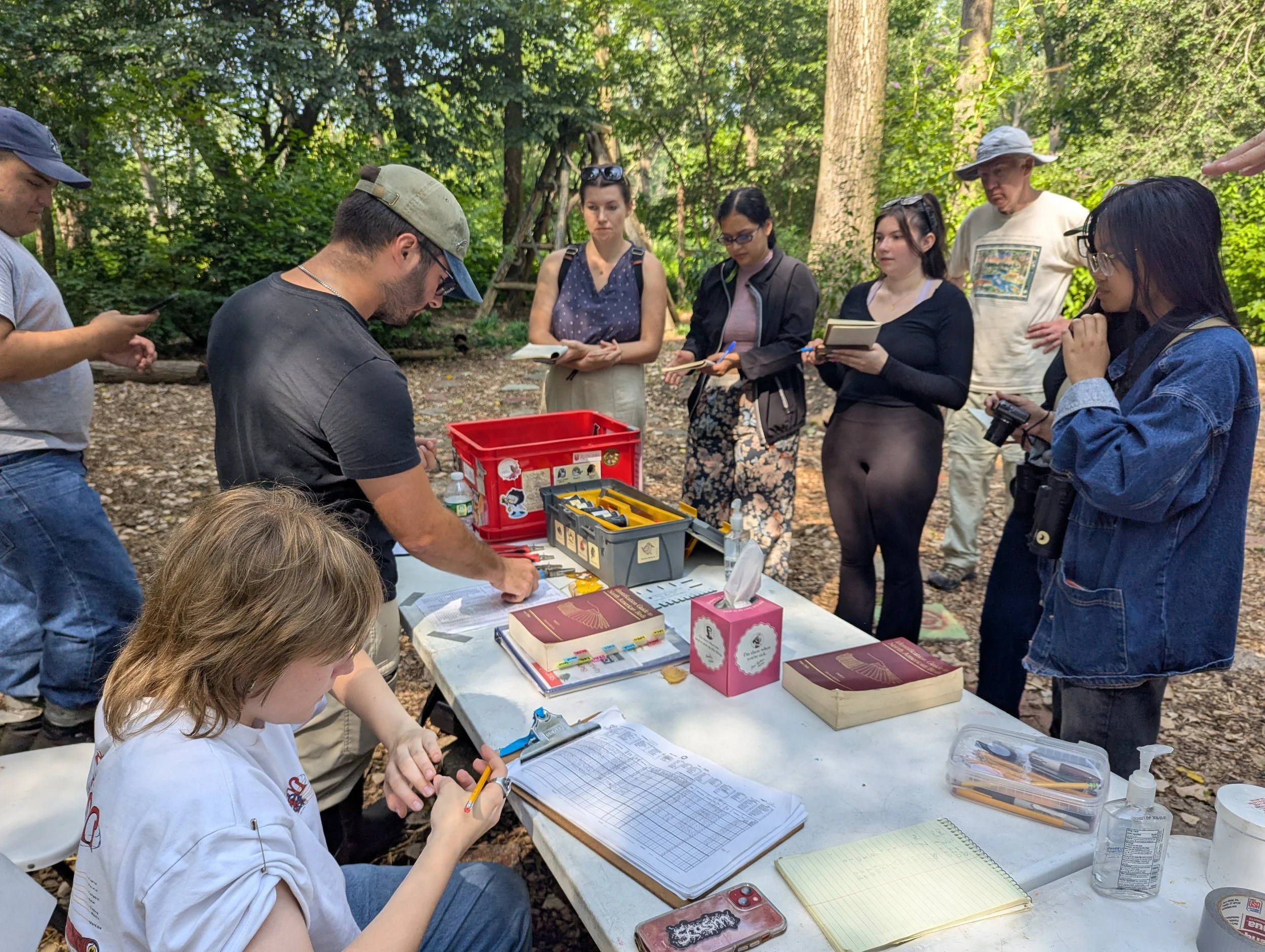 Rutgers Newark Students gather around the Teaneck Creek Banding Station to learn about banding birds.