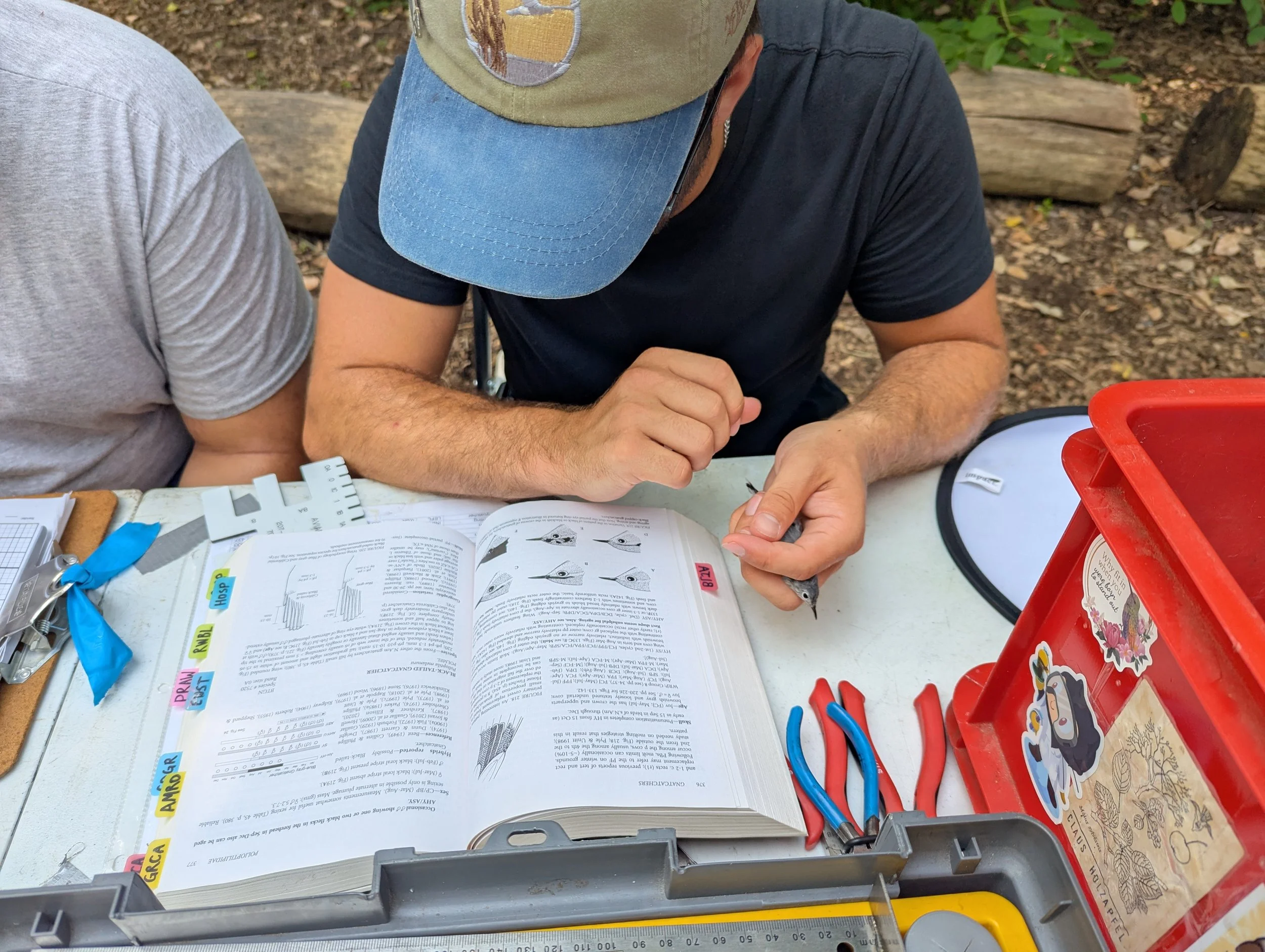 A Teaneck Creek bird bander reviews the plumage in a field guide to verify the age of the bird in his hand.