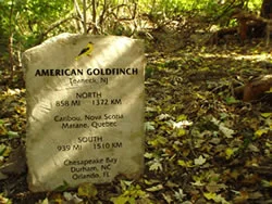 The Hackensack Meadowlands once covered over 21,000 acres, two-thirds of which have been developed. The remaining one-third now consists predominately of salt marshes and open water, with only small disconnected parcels that sustain forests. The Teaneck Creek Conservancy (TCC) contains some of these last remnants of the forested wetlands that were originally part of the freshwater portion of the complex Hackensack Meadowlands ecosystem. Some of the migratory species that have been observed in our forested TCC habitat include warblers, juncos, woodpeckers, and monarch butterflies. As you walk the trails of the TCC you will find the ‘Milepost Markers’ created by artist Lynn Hull. These artworks created from concrete slabs of construction debris found on site identify some of our visitors and detail their journeys around the world.