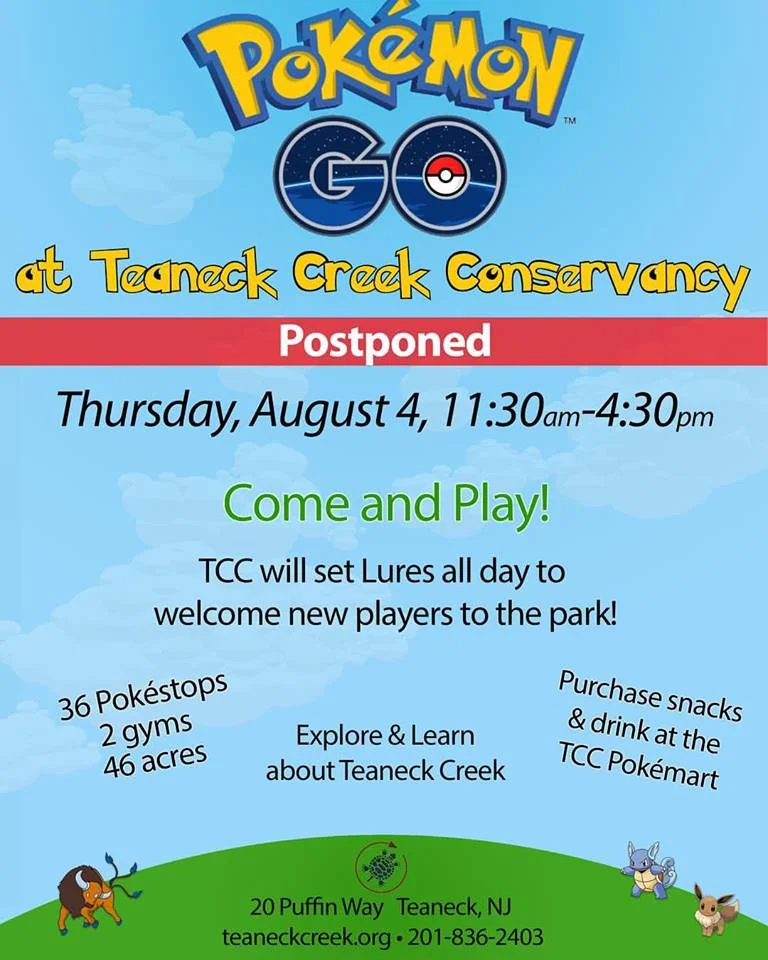 Pokemon Go at Teaneck Creek Conservancy Thursday, August 4, 2016 11:30 AM 4:30 PM 11:30 16:30 Teaneck Creek Conservancy 20 Puffin Way Teaneck, NJ, 07666 United States (map) Google Calendar ICS Due to threat of severe thunderstorms on July 29th, this event has been postponed to August 4th ! We hope you can join us!