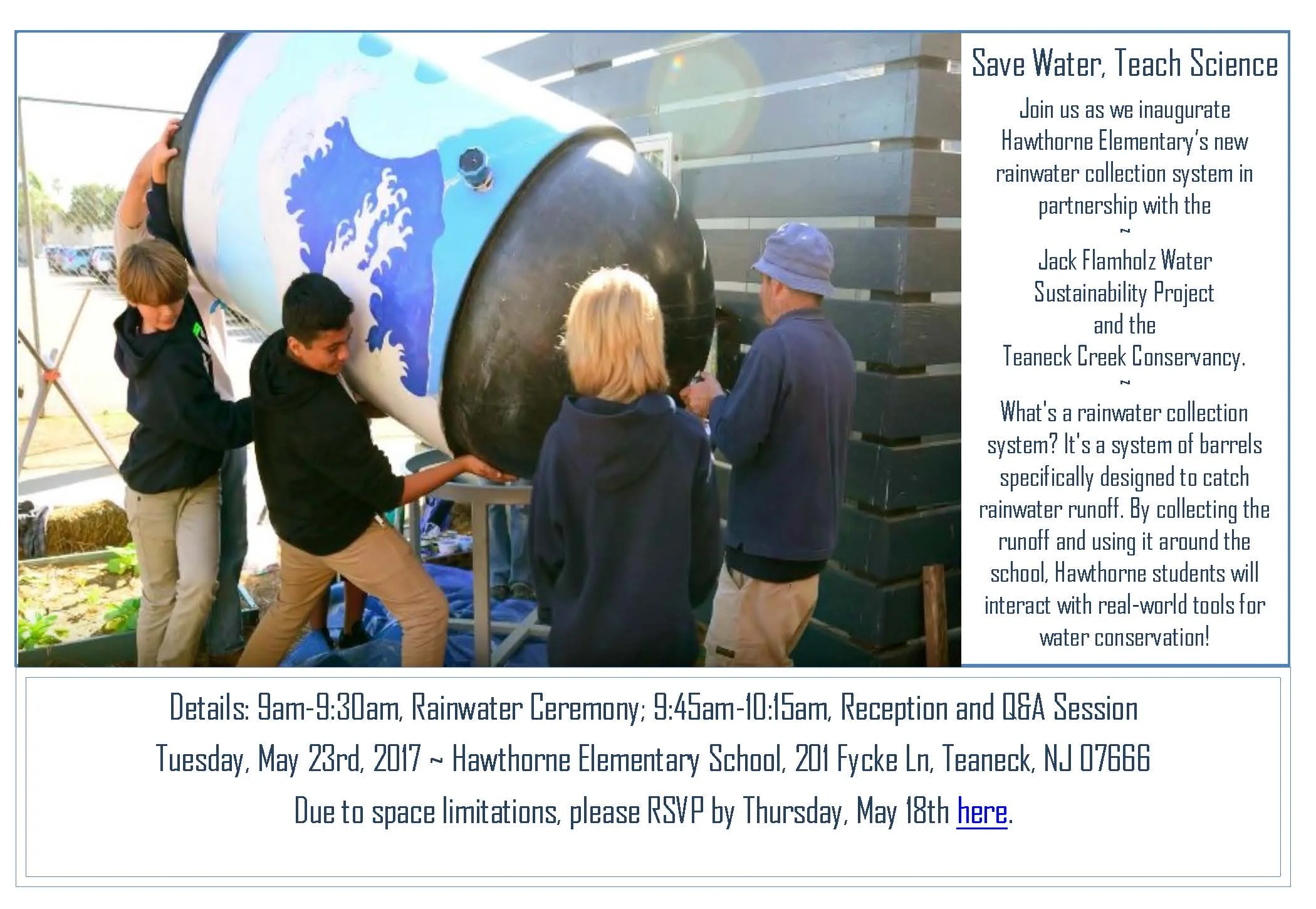 Save Water, Teach Science at Hawthorne Elementary Tuesday, May 23, 2017 9:00 AM 10:15 AM 09:00 10:15 Hawthorne Elementary School 201 Fycke Lane Teaneck, NJ, 07666 United States (map) Google Calendar ICS Join us as we inaugurate Hawthorne Elementary’s new rainwater collection system CLICK HERE TO RSVP